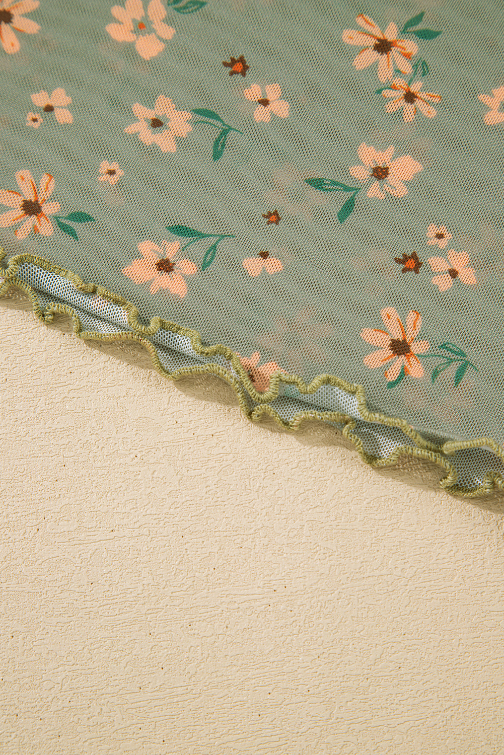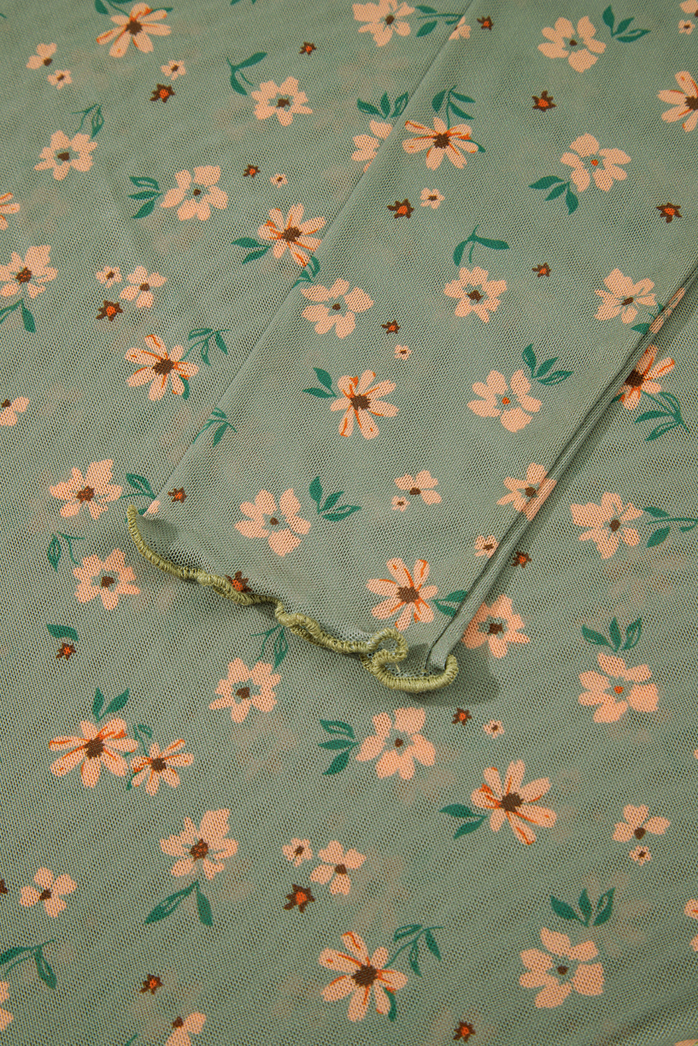 Laurel Green Floral Print Mesh Slim Fit Long Sleeve Top