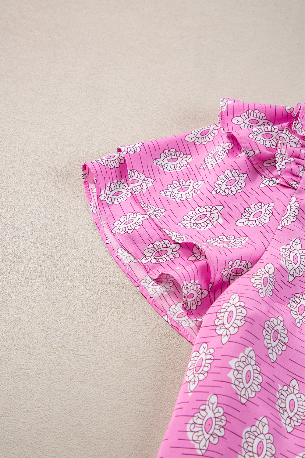 Pink Vintage Floral Ruffled Split Neck Layered Sleeve Blouse